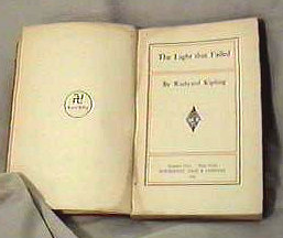 Photo at right shows fly leaf of The Light that Failed by Rudyard Kipling, displaying the running cross symbol.