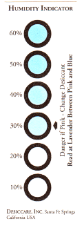 The percent of relative humidity is on the card, and you will figure this by the spot which is lavender between blue and pink. This card is used in the silica gel trade in another application, so you will ignore the instruction to "change the deccicant."