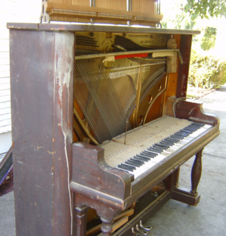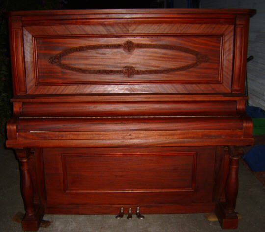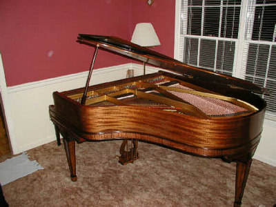 I do want to stress the virtue of hand rubbed Tung Oil, especially the top quality brand by Formby's. This process will get the most natural and deep complementary results, AND you use only your hand to rub it on. This eliminates the hazard of lacquer and urethane, in which you can get brush strokes and runs. When spraying on a finish, if there are imperfections or dusk in the air, you cannot detail them out. With Tung Oil, you can buff them out with 0000 steel wool, and add another coat. Tung Oil is also more tolerant to humidity problems, which is NOT the case with lacquer. Again, we commend David McNeeley for this exceptional restoration. But, we want YOU to understand that this result is available to anyone with persistence and a perfectionist attitude toward the work. David must have spent around $300 on materials, and some labor to the tuner for doing the keytops and hammers. David's total investment must be around $1200. This total is minimal compared to the cost of buying such a restored piano, which I would estimate at minimum $5000 in any showroom. Also, I hope you noted that much of the task was completed during a six week period. Best of all, some kid someday, when David has passed on, may say to his friend, "My grandpa made that piano." Well, kids say things like that, but who would argue? You may think we are being a bit mushy, but we really do feel good about making a living in a way that brings back these old beautiful instruments to use. It sure beats running a Roto Rooter or writing parking tickets in Padukah. I hope you understand that the new pianos today do NOT have the quality of veneer used in these old instruments. Urethane is used on Japanese and Korean pianos to cover up the poor quality of the wood underneath. The veneer on the above Chickering all came from the same tree, and it looks like it was "quarter cut." In this process the veneer was sliced off the butt of the tree at a 45 to 30 degree angle, layer by layer. This generated very busy and artistic patterns in the veneer. This is NOT done anymore. You will find, if you ever see a modern veneer job, that the pattern of the veneer is very long and not very interesting. Chickering was possibly the first piano company in America to do production work, and since the piano was made before the Great Crash of '29, there is no doubt about quality. You always want to have a good look at the quality of a post '29 piano. Some companies got into financial trouble and cut quality to survive the Great Depression. We do thank God for letting us use the medium of the Web, and the zeal of folks like David McNeeley, to put our cabbages on the dinner table. It IS a good life indeed. QUESTION: