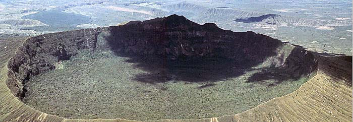 Bob Capen and I would have come up to the crater at the lower center of the photo. We then followed the very top of the rim on a well worn path moving to the right. At about the center of the right curve in the photo, we climbed down into the crater where there is a steam jet. If you take along your potatoes and a lump of meat in a mess bag, you can cook your lunch by hanging it down the steam jet, or so I am told. Bob Capen and I then crossed the bottom of the crater from right to left right across the center of the photo. The plants in the bottom of the crater were a pale dull green, and every plant, though technically alive, broke as if it had died. This must have been due to the mineral content from the lava dissolved into the ground water.