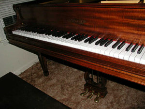 I do want to stress the virtue of hand rubbed Tung Oil, especially the top quality brand by Formby's. This process will get the most natural and deep complementary results, AND you use only your hand to rub it on. This eliminates the hazard of lacquer and urethane, in which you can get brush strokes and runs. When spraying on a finish, if there are imperfections or dusk in the air, you cannot detail them out. With Tung Oil, you can buff them out with 0000 steel wool, and add another coat. Tung Oil is also more tolerant to humidity problems, which is NOT the case with lacquer. Again, we commend David McNeeley for this exceptional restoration. But, we want YOU to understand that this result is available to anyone with persistence and a perfectionist attitude toward the work. David must have spent around $300 on materials, and some labor to the tuner for doing the keytops and hammers. David's total investment must be around $1200. This total is minimal compared to the cost of buying such a restored piano, which I would estimate at minimum $5000 in any showroom. Also, I hope you noted that much of the task was completed during a six week period. Best of all, some kid someday, when David has passed on, may say to his friend, "My grandpa made that piano." Well, kids say things like that, but who would argue? You may think we are being a bit mushy, but we really do feel good about making a living in a way that brings back these old beautiful instruments to use. It sure beats running a Roto Rooter or writing parking tickets in Padukah. I hope you understand that the new pianos today do NOT have the quality of veneer used in these old instruments. Urethane is used on Japanese and Korean pianos to cover up the poor quality of the wood underneath. The veneer on the above Chickering all came from the same tree, and it looks like it was "quarter cut." In this process the veneer was sliced off the butt of the tree at a 45 to 30 degree angle, layer by layer. This generated very busy and artistic patterns in the veneer. This is NOT done anymore. You will find, if you ever see a modern veneer job, that the pattern of the veneer is very long and not very interesting. Chickering was possibly the first piano company in America to do production work, and since the piano was made before the Great Crash of '29, there is no doubt about quality. You always want to have a good look at the quality of a post '29 piano. Some companies got into financial trouble and cut quality to survive the Great Depression. We do thank God for letting us use the medium of the Web, and the zeal of folks like David McNeeley, to put our cabbages on the dinner table. It IS a good life indeed. QUESTION: